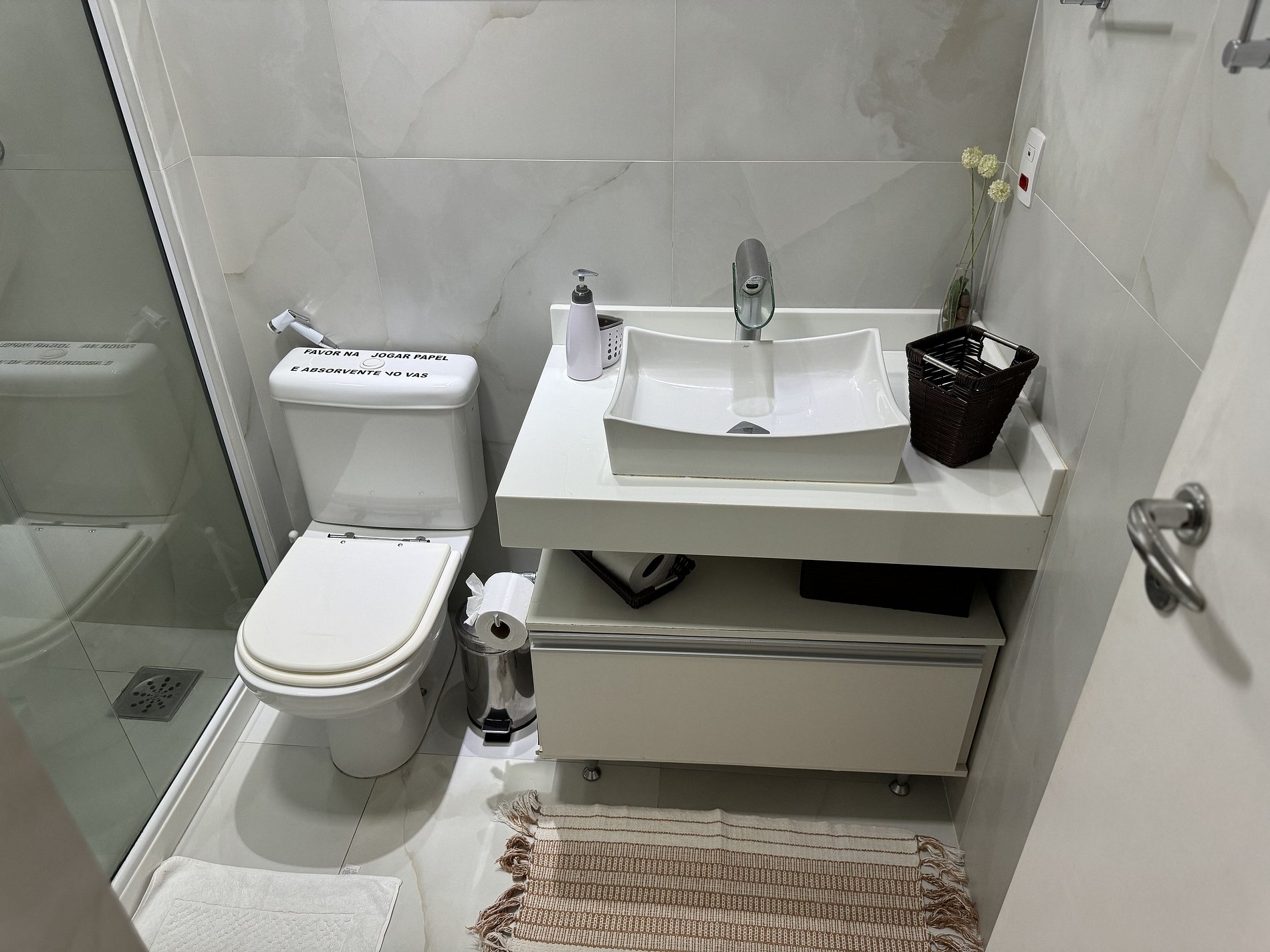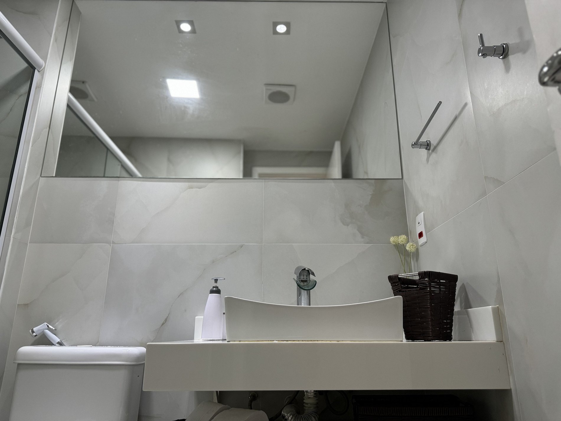 BANHEIRO -- O Banheiro com espelho abrangente; * Bancada granito nano glass; * Cuba e torneira design ( água fria e quente); *Gavetão; * Box em vidro temperado; * Alça de segurança no interior do box (evita quedas), * Secador;
